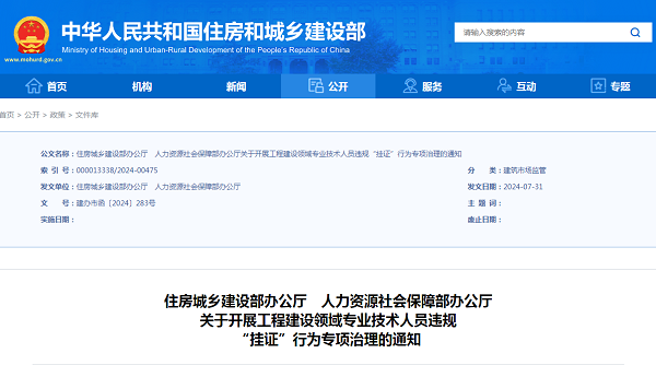 住建部聯(lián)合人社部發(fā)布《關(guān)于開展工程建設(shè)領(lǐng)域?qū)I(yè)技術(shù)人員違規(guī)“掛證”行為專項(xiàng)治理的通知》: