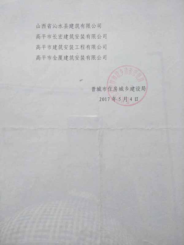 2017年5月4日,接晉城市住房城鄉(xiāng)建設(shè)局有關(guān)通知,晉城市金建建筑有限公司入選2017年晉城市骨干建筑業(yè)企業(yè)名單。2017年晉城市骨干建筑業(yè)企業(yè)自公布之日起,“骨干建筑業(yè)企業(yè)”稱號有效期一年。今后,每年評選一次,每年****季度評選完成,“骨干建筑業(yè)企業(yè)”稱號有效期一年。